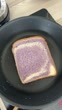 Close up of a woman cooking a slice of purple yam bread in a black frying pan. The bread is taken from a checkered paper bag and placed directly into the pan.