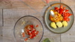 Plating tomato salsa with onion. Cordon bleu dish. Pressure cooked potatoes. Drizzling olive oil on top.