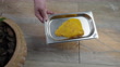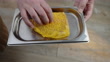 Cordon bleu or schnitzel cordon bleu. Uncooked in stainless steel kitchen tray. Wooden table. Light effect.