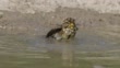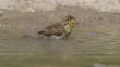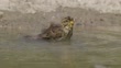 A Corn Bunting [Emberiza calandra] bathing in a puddle. Picture taken in Swindon, Wiltshire, England on the 14th of July 2022.