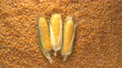 Top down shot of 3 corn cobs falling onto a bed of dry corn kernels in super slow motion