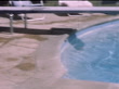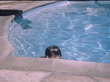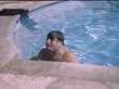 Costello's daughters Patricia and Carole talk into oversized novelty telephone, their father comes up for air in the pool.