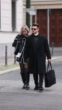 BERLIN, GERMANY - DECEMBER 5: (SLOW-MO) Couple Aline Kaplan wears grey coat white white lines Toteme, cardigan H&M, black mini skirt Mango, tights, boots Flattered, black bag Anine Bing & André Hellmundt wears black coat Review, grey jacket Cinque, creme white turtleneck Cinque, black pants Cinque, shoes Cinque, Sandro bag on December 5, 2022 in Berlin, Germany. (Footage by Christian Vierig/Getty Images)