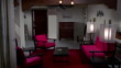 A couple (Ana Martin and Cesar Costa) enters a 1970 house with red chairs and retro style.