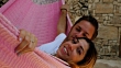 CU Couple sitting in hammock together while on vacation at luxury resort - 4K stock video