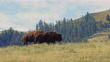 A bull and cow Bison walk in a meadow of prairie grass in the mountains of Yellowstone National Park.