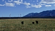 With cows grazing just outside the small town of Monticello, huge, modern, wind turbines, part of the Latigo Wind Farm spin in the wind, generating energy in the snow capped Abajo Mountains in the Manti-La Sal National Forest in southeast Utah.