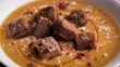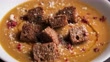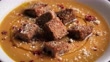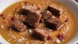 Italian dish Cream pumkin soup with pieces of baked bread and parmesan chesse, 360 degree