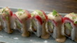Sushi Roll: Crispy shrimp, avocado topped with tuna, acebichado sauce, togarashi, green onion - 4K stock video