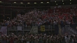 A crowd cheers as they watch a football game from the bleachers. - HD stock video