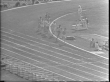 Crowd rises to their feet to watch the 5000 meter run / the gun fires and the men in the 5000 meter take off / overhead shot of the race / Gunder Hagg moves into second place on the track.
