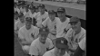 Crowds at Yankee Stadium to watch retired Yankees and native New Yorker baseball players play an exhibition game to honor Lou Gehrig / crowds in stands / retired players in dugout / photographers / pan retired players sitting and standing in dugout / former New York Giants Jimmy Ring and Frankie Frisch shaking hands / former Yankees Vernon "Lefty" Gomez, Waite Hoyt, Bill Dickey, Charles "Red" Ruffing stand with arms around shoulders / CU pan Ruffing to Dickey to Hoyt to Gomez / Wally Pipp, former Yankees first baseman, sitting in chair at first base, catches ball, steps on base, takes cap off to fan himself / Al Schacht, former Washington Senators pitcher, and actor Joe E. Brown joking around on the field / former Detroit Tiger Hank Greenberg / pan photographers and cameramen to former Yankee Joe DiMaggio and current Yankee outfielder Mickey Mantle, DiMaggio and Mantle holding bats / CU DiMaggio and Mantle