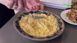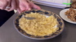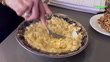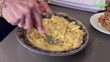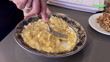 High angle close-up shot of a senior woman crushing banana slices in plate with a fork in a domestic kitchen for preparing banana bread