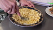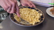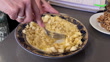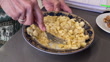 High angle close-up shot of a senior woman crushing banana slices in plate with a fork in a domestic kitchen to prepare banana bread