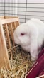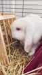 A white female lop-eared rabbit feeding on hay from a hay rack, takes a break to smell the intruding person.