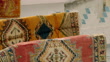 Close views of musical instruments, including a string instrument called an oud and an ornate drum known in English as a goblet drum and tilting close view of colourful, decorative rugs in daylight, Tangier, Morocco. (FKIU432J - ABTA682A)