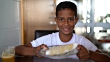Cute brazilian boy eating tapioca as the breakfast - HD stock video