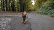 Happy cute terrier dog running on a road in autumn
