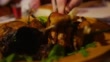 Cutting roasted leg of lamb with a knife in Gainsborough Old Hall, UK - 4K stock video