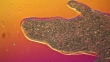 "Light microscopy of the pseudopod of a Chaos carolinensis amoeba, showing cytoplasm streaming into the extending 'foot'. Algae and captured prey items flow with the cytoplasm as it moves. C. carolinensis is a giant amoeba that may contain numerous nuclei and reach up to five millimetres in diameter. Recorded under Nomarski differential interference contrast illumination."