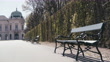 Vienna, Austria - Empty park of the Upper Belvedere (Park Belvedere) with a park bench (Parkbank) during Covid 19 lockdown