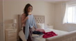 Push in wide shot of a woman with a stoma bag getting ready in her bedroom in the North East of England. She throws her clothes from her wardrobe onto her bed before walking into the shot, holding different outfits up, trying on different clothes to see what she wants to wear that day.Stills are available similar to this scenario.