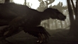 A Deinonychus attacks a large dinosaur in a jungle in a computer-generated animation.