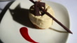 A white plate with a cheesecake decorated with chocolate and a raspberry coulis.