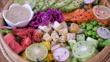 Delicious freshly prepared salad with fresh vegetables, tofu and spicy sauce. - 4K stock video