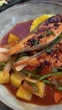 Grilled salmon fillets served with saffron rice and mixed vegetables