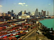 Detroit skyline as viewed from Ambassador Bridge, a portion of which is visible / Detroit skyline: rail yard in foreground, pan right across Detroit River to Windsor, Ontario, Canada / Spirit of Detroit statue. Detroit Skyline on January 01, 1963 in Detroit, Michigan (Footage by Getty Images)