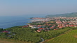Aerial view of Izola, Slovenia, showcasing the marina filled with sailboats and the charming waterfront town. The scene transitions from lush vineyards to the vibrant coastal area, capturing the serene beauty of the Adriatic Sea.