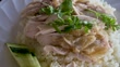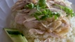 A neatly plated dish of Khao Mun Gai, Thailand’s version of Hainanese chicken rice, features tender poached chicken over fragrant jasmine rice cooked in chicken fat. Served with a light clear soup and a tangy chilli–ginger soy sauce, this popular street food showcases balanced flavours and simplicity across Thailand.