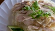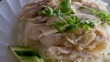 A dish of Khao Mun Gai, Thai-style Hainanese chicken rice served with fragrant rice, clear soup, and spicy ginger sauce. - 4K stock video