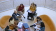 A birds-eye view of an academic group meeting in natural light with bright furniture.