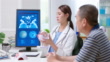 attractive young brunette ponytail female asian doctor wear white coat and stethoscope explaining xray film on computer with eye model to gray hair old sick man at clinic
