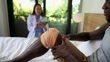 A male patient sits on a bed and adjusts the elastic bandage wrapped around his knee as a female doctor monitors his condition.