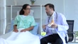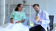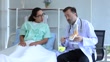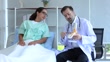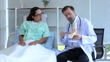 Doctor shows anatomy of structure of human knee joint and talking with female patient. Happy male doctor sitting face to face with senior patient in examination - 4K stock video
