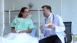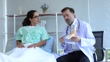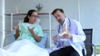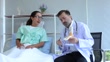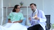 Doctor shows anatomy of structure of human knee joint and talking with female patient. Happy male doctor sitting face to face with senior patient in examination - 4K stock video