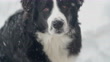 MCU shot of mixed breed puppy looking at camera as snow falls around him.