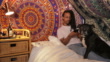 A front-view shot of an African man sitting on his bed in a stylish bedroom, he is on his phone while his dog jumps on him for attention.