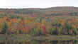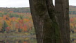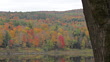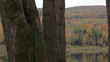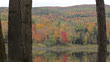 A dolly shot of tree trunks in foreground, yellow and orange trees in background with their reflection doubled in a pond below. - HD stock video