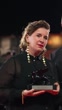 VENICE, ITALY - SEPTEMBER 7: (SLOW-MO) Dorothe Beinemeier (R) poses with the Horizons Best Screenplay award for "Happy Holidays" during the 81st Venice International Film Festival at Palazzo del Cinema on September 7, 2024 in Venice, Italy. (Footage by Mark Case/Getty Images)