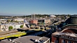Drone shot of the city of Tacoma, Washington, USA, including Union Station and the Tacoma Dome, with Mt Rainier in the distance.
