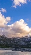 Big white fluffy clouds blow across a high mountain lake in the Eastern Sierra Mountains at Sunset. The clouds roll quickly across the vibrant blue sky as light dances on the peaks of the mountains above a crisp mountain lake. The Lake is Lake Sabrina near Bishop, CA. The camera pans from left to right across the lake.
