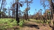 Driver's view while driving down winding dirt road through recovering forest of slash pine, Saw Palmetto and cabbage palms, after a controlled burn - 4K stock video