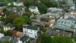 Aerial establishing shot of Provincetown, Massachusetts on a foggy overcast morning in Fall.