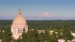 Aerial establishing shot of the state capitol building in Olympia, Washington on a summer afternoon, with the snowy mass of Mt Rainier/Tahoma in the distance.