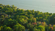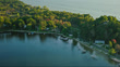 Aerial establishing shot of lake houses in Whitehall, Michigan near Lake Michigan, on a clear day in Fall.