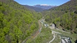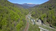 Aerial shot following a train through the winding rails of Posada valley, Prahova county, in Romania; upwards the Prahova river.